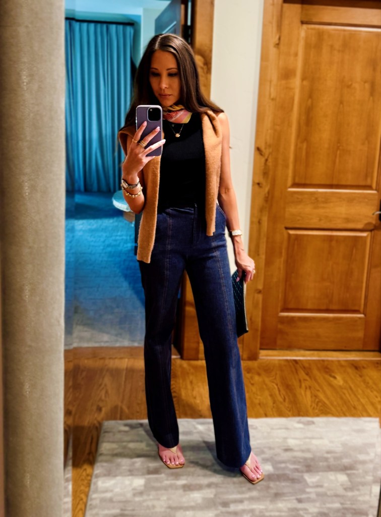 This was my dinner look for La Nonna. I wore denim trousers with a knit sleeveless top, and cashmere sweater over my shoulders because it turns cold after the sun goes down and I think it just adds to the look. I also tied a silk scarf around my neck for an added pop of color. My shoes are a thong sandal with a low block heel (a wedge would work well with this too) to dress up the look, but it’s not too dressy or hard to walk in.