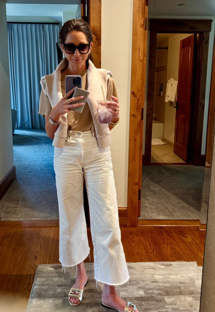 Comfort is key when traveling, but I never want to look sloppy. I always go for comfortable, loose fitting pants or jeans. These are Veronica Beard and my current go-to white jean.